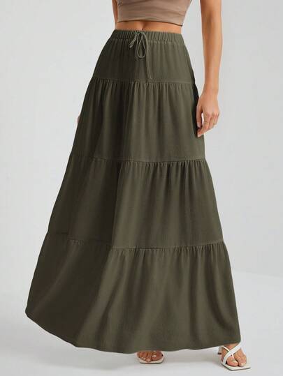 SHEIN Tall 白色梭织女式大下摆白色衬里半身裙,适合度假和外出穿着 - 橄欖綠 - 查看 1