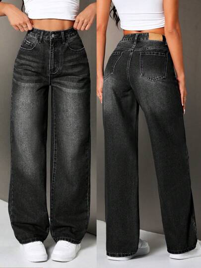 SHEIN Tall 女士做旧褪色牛仔裤 - 黑色 - 查看 1