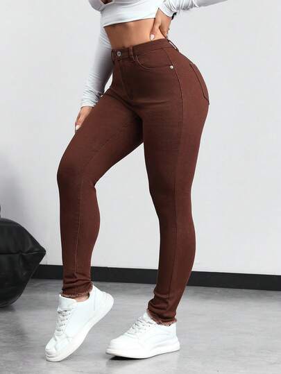 SHEIN Tall 女士休闲通勤水洗修身牛仔裤 - 棕色 - 查看 1