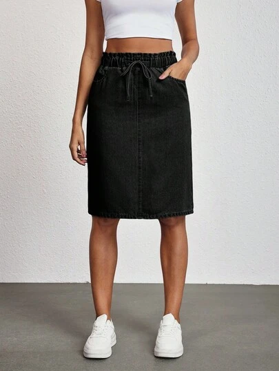 SHEIN Tall 女式抽绳腰口袋直筒休闲牛仔裙 - 黑色 - 查看 1