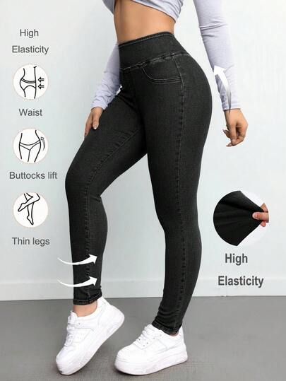 SHEIN Tall 女士牛仔裤 性感紧身弹力裤 高腰 女士紧身牛仔裤 牛仔裤 瑜伽裤 喇叭裤 保暖女士打底裤 女士打底裤 女士打底裤 保暖女士打底裤 女士打底裤 高腰女士裤子 - 黑色 - 查看 5