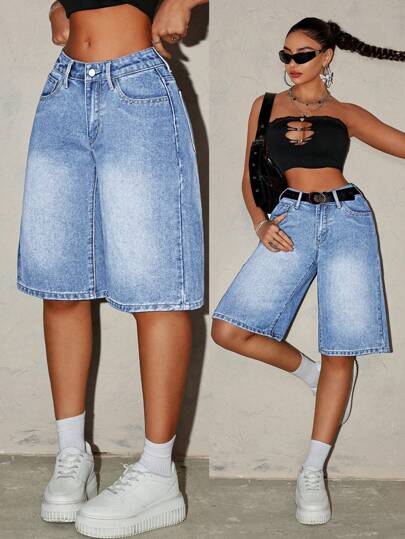 SHEIN Tall 女式渐变色口袋夏季休闲宽松牛仔短裤 - 淺色水洗藍 - 查看 1