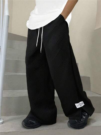 SHEIN 青少年男孩松紧腰抽绳宽松直筒黑色休闲运动裤 - 黑色 - 查看 1