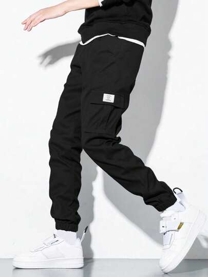 SHEIN 青少年男孩休闲工装口袋慢跑裤,灰色,百搭,日常穿着,学院风,男孩服装 - 黑色 - 查看 1