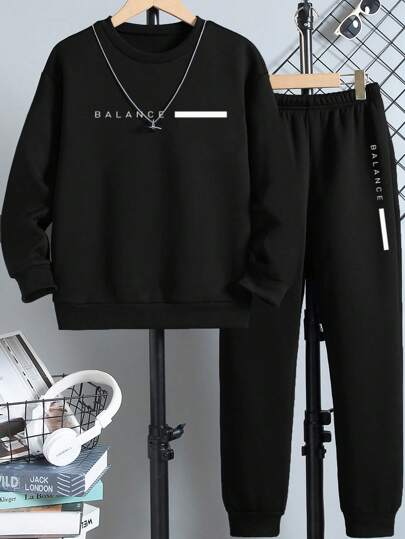 SHEIN 青少年男孩字母圖案運動衫和運動褲兩件套 - 黑色 - 查看 1