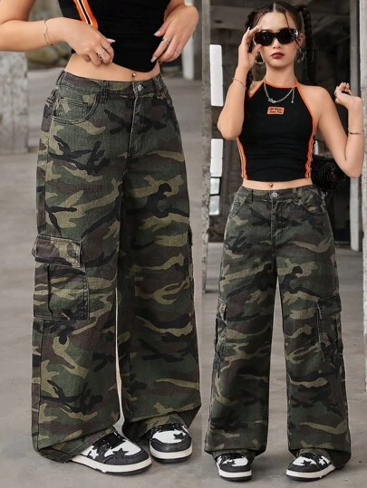 SHEIN 少女休闲迷彩图案工装牛仔裤(水洗) - 軍綠色 - 查看 1