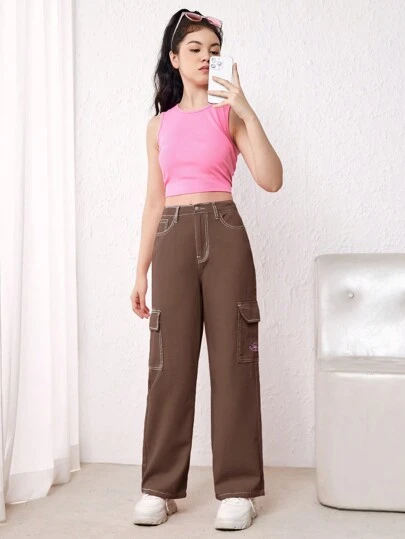 SHEIN 青少年女孩側翻蓋口袋工裝牛仔褲 - 棕色 - 查看 1