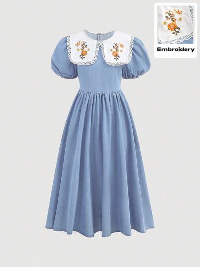 SHEIN 少女花卉刺绣泡泡袖牛仔连衣裙,夏季 - 淺色水洗藍 - 查看 1