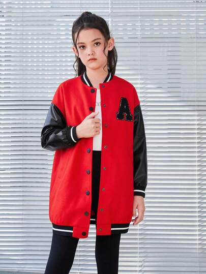 SHEIN 青少年女孩字母貼布條紋飾邊落肩袖學院風夾克 - 綠色 - 查看 6