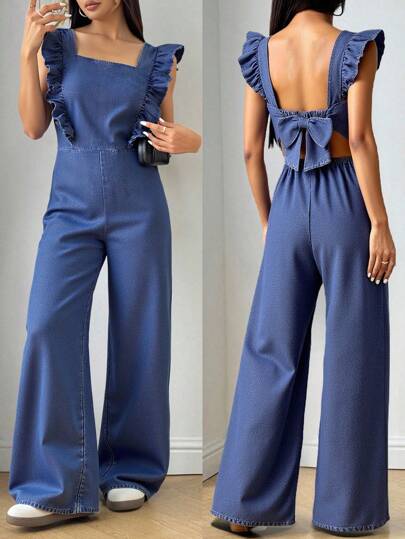 SHEIN 少女夏季纯色水洗无袖露背露背连体裤,带蝴蝶结和荷叶边装饰,休闲风格和休闲版型,女孩夏季海滩波西米亚风度假休闲装,狂欢音乐会节日装,返校 - 深色水洗藍 - 查看 1