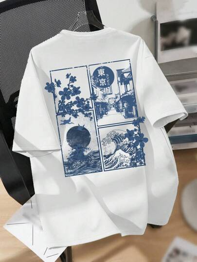 SHEIN 青少年男童休闲卡通风景印花短袖 T 恤,棉混纺,适合夏季 - 白色 - 查看 1