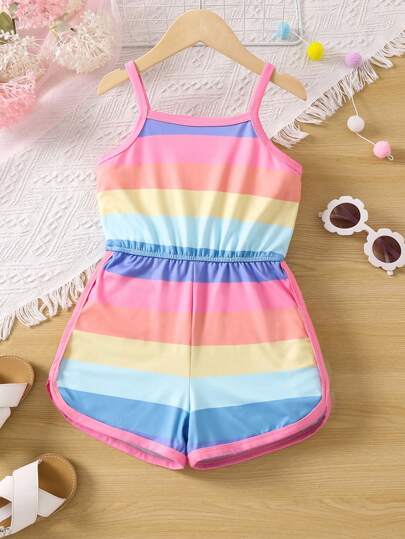 SHEIN 少女拼色彩虹紋織褲連身裝,夏季簡約舒適,細肩帶設計 - 彩色 - 查看 1