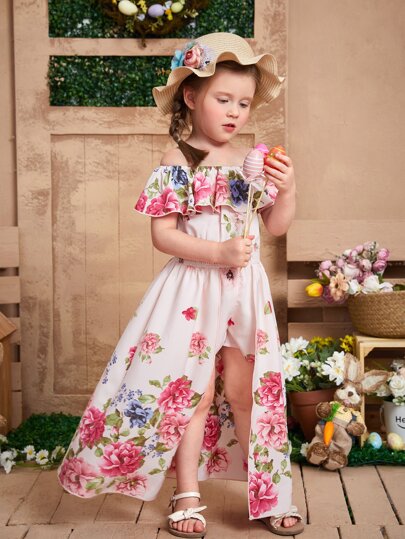 SHEIN 小女童印花一字肩荷葉邊覆蓋連身短褲 - 彩色 - 查看 1