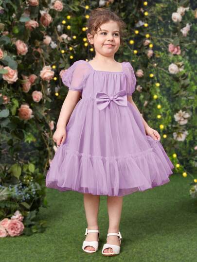SHEIN 小女童泡泡袖前蝴蝶結荷葉邊網紗連衣裙 - 紫丁香色 - 查看 1