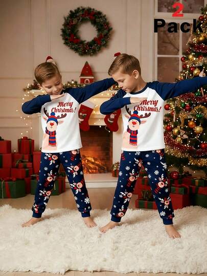 SHEIN 青少年男孩休闲简约圣诞可爱鹿印花舒适长袖圆领睡衣套装,适合秋冬季 - 紅色 - 查看 1