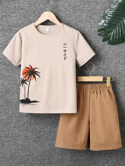 SHEIN 日文字母和棕櫚樹印花t卹和短褲,適用年齡為10-14歲的男童 - 彩色 - 查看 1