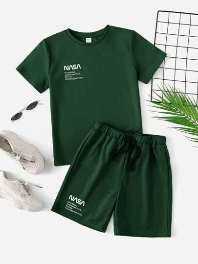 SHEIN 男大童字母圖案T恤&腰部抽繩短褲 - 墨綠色 - 查看 1