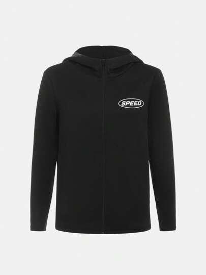 SHEIN 男大童字母圖案拉鏈開襟連帽活躍夾克不帶T恤 - 黑色 - 查看 1