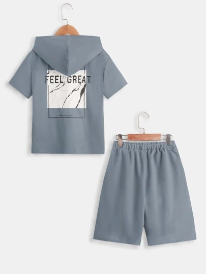 SHEIN 男孩標語圖案連帽T恤和腰部抽繩短褲 - 霧霾藍 - 查看 1