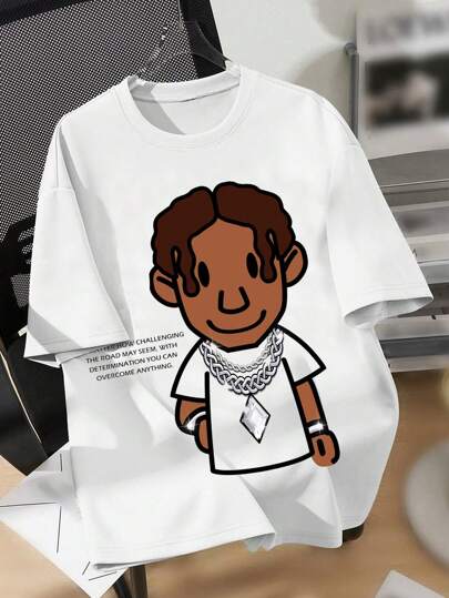 SHEIN 青少年男孩休閒卡通印花圓領寬鬆針織短袖t恤,有標語 - 白色 - 查看 1