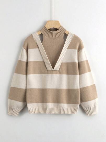 SHEIN 少女 2 合 1 露肩条纹套头毛衣 - 卡其色 - 查看 1