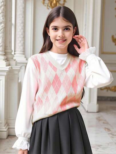 SHEIN 少女菱形圖案毛衣背心 - 彩色 - 查看 1