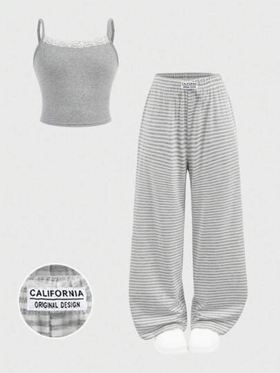 SHEIN 少女休闲家居服套装,修身蕾丝边吊带背心搭配阔腿条纹针织裤,浅灰色 - 灰色 - 查看 1
