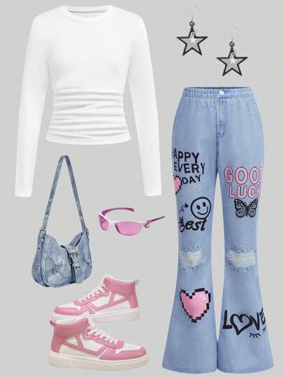 SHEIN 青少年女孩剪裁短上衣和趣味印花宽松直筒裤套装 - 彩色 - 查看 1