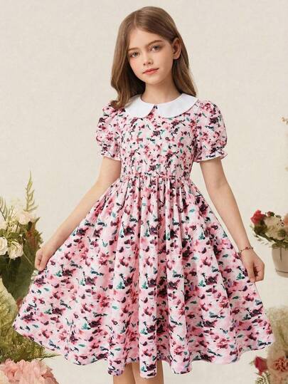 SHEIN 少女彼得潘领泡泡袖印花连衣裙 - 彩色 - 查看 1