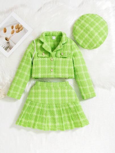 SHEIN Tween 女童格子粗花呢时尚奢华夹克和百褶裙两件套