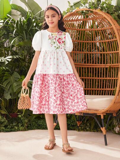 SHEIN 少女款編織花卉印花圓領寬鬆休閒度假裙,泡泡袖設計