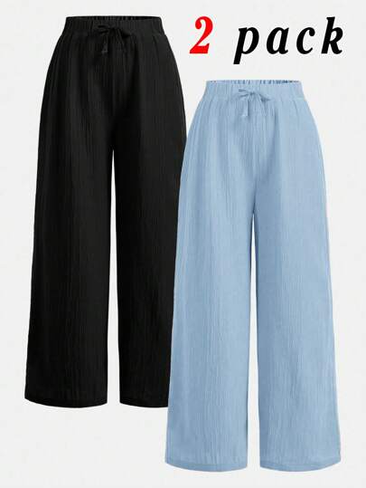 SHEIN 青少年女孩两件套:纹理梭织宽松阔腿裤和领带蝴蝶结细节,休闲假日风格 - 淺藍色 - 查看 1