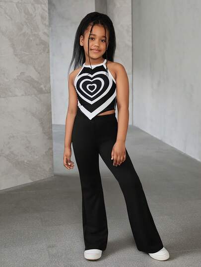 SHEIN Tween 女童休闲基本款针织无袖吊带背心和纯色喇叭裤套装 - 黑色 - 查看 1