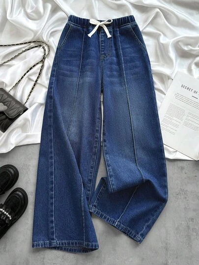 SHEIN 少女休闲日常水洗斜插口袋抽绳腰牛仔裤 - 深色水洗藍 - 查看 1