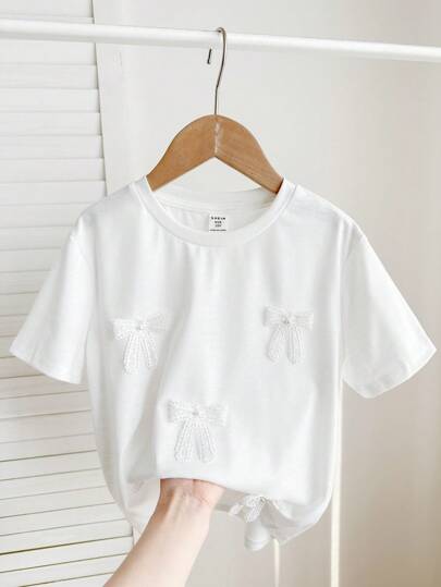 SHEIN Tween Girls 可爱 3D 蝴蝶结设计白色 T 恤,百搭休闲日常穿着,适合任何场合 - 白色 - 查看 3