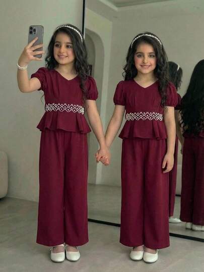 SHEIN 少女优雅串珠泡泡袖V领收腰上衣及配套纯色梭织长裤套装,酒红色,春夏款 - 酒紅色 - 查看 1