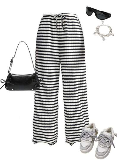 SHEIN Tween 女童秋冬抽绳腰条纹宽腿宽松休闲裤 - 黑與白 - 查看 1