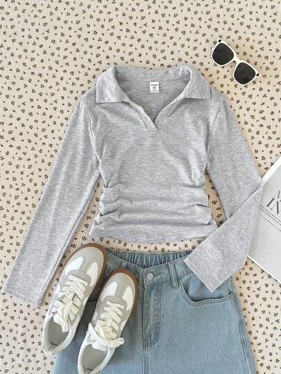 SHEIN 少女针织长袖T恤,时尚百搭休闲基础款 - 淺灰色 - 查看 1