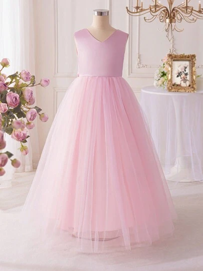 SHEIN Tween 女童纯色提花无袖网眼拼接荷叶边下摆公主裙,适合毕业典礼、生日派对 - 粉色 - 查看 1