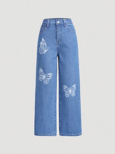 SHEIN Tween 女童街头风格蝴蝶印花休闲宽松直筒牛仔裤 - 中等水洗藍 - 查看 1