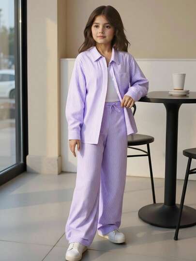SHEIN 青少年女孩三件套,街头酷炫条纹长袖衬衫、裤子和吊带背心,适合春季和秋季 - 彩色 - 查看 10