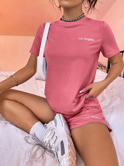 SHEIN Unity 字母圖案T恤和短褲 - 西瓜粉 - 查看 1
