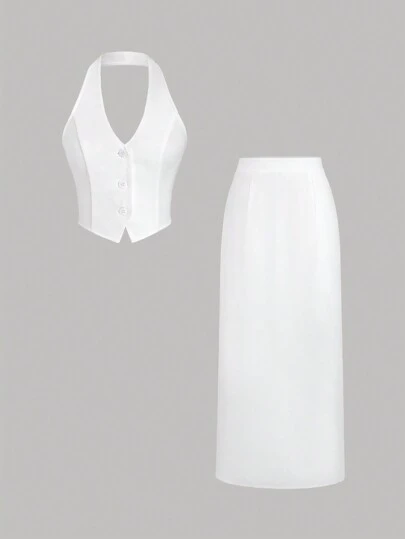 SHEIN Unity 夏季單排扣雙肩帶上衣和裙子套裝 - 白色 - 查看 1