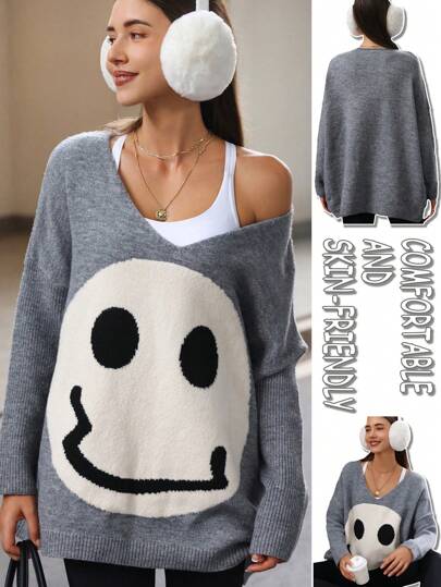 SHEIN Unity 女士V领可爱笑脸图案宽松休闲毛衣,秋冬