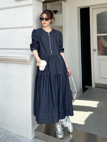 SHEIN Unity 女式秋季深牛仔蓝休闲通勤长款牛仔连衣裙,女式秋季服装,返校节服装,外出服装,商务休闲女装,哥特式女装 - 深色水洗藍 - 查看 1