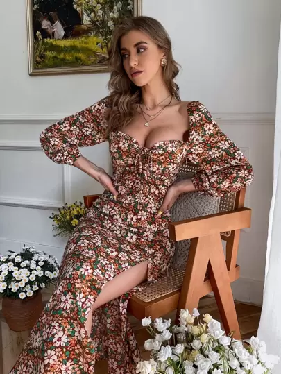 Aveloria 滿身花卉雞心領口高衩連衣裙 - 彩色 - 查看 1