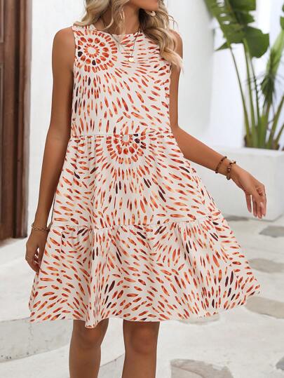SHEIN VCAY 滿版印花荷葉邊娃娃裙 - 杏色 - 查看 1