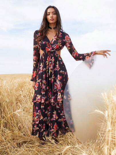 SHEIN VCAY 印花荷葉袖荷葉邊洋裝 - 黑色 - 查看 1