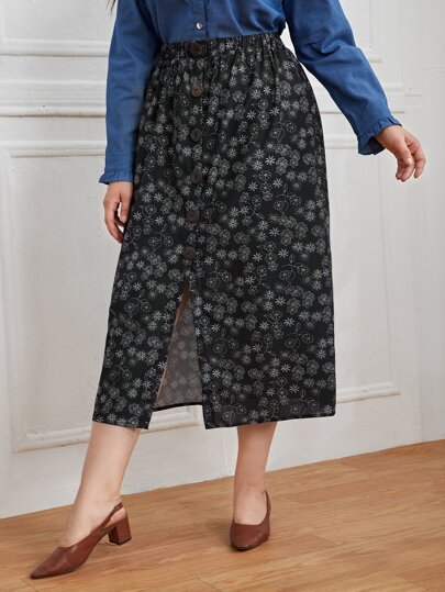 SHEIN VCAY 大碼小碎花單排釦開叉半身裙 - 黑與白 - 查看 1