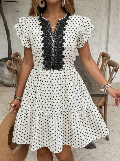 SHEIN VCAY 大码女式蕾丝波点荷叶袖优雅连衣裙